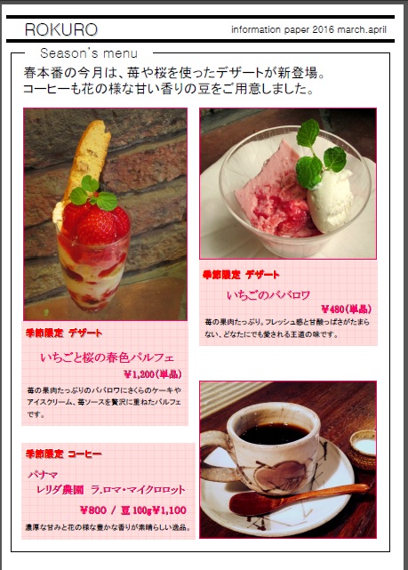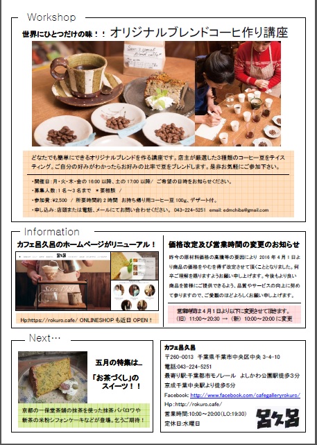 インフォメーションペーパーができました。 2016.03.07 ニュース お店のインフォメーションペーパーができました。 月替わりのメニューやワークショップの情報などご紹介していきますのでぜひご覧下さい。